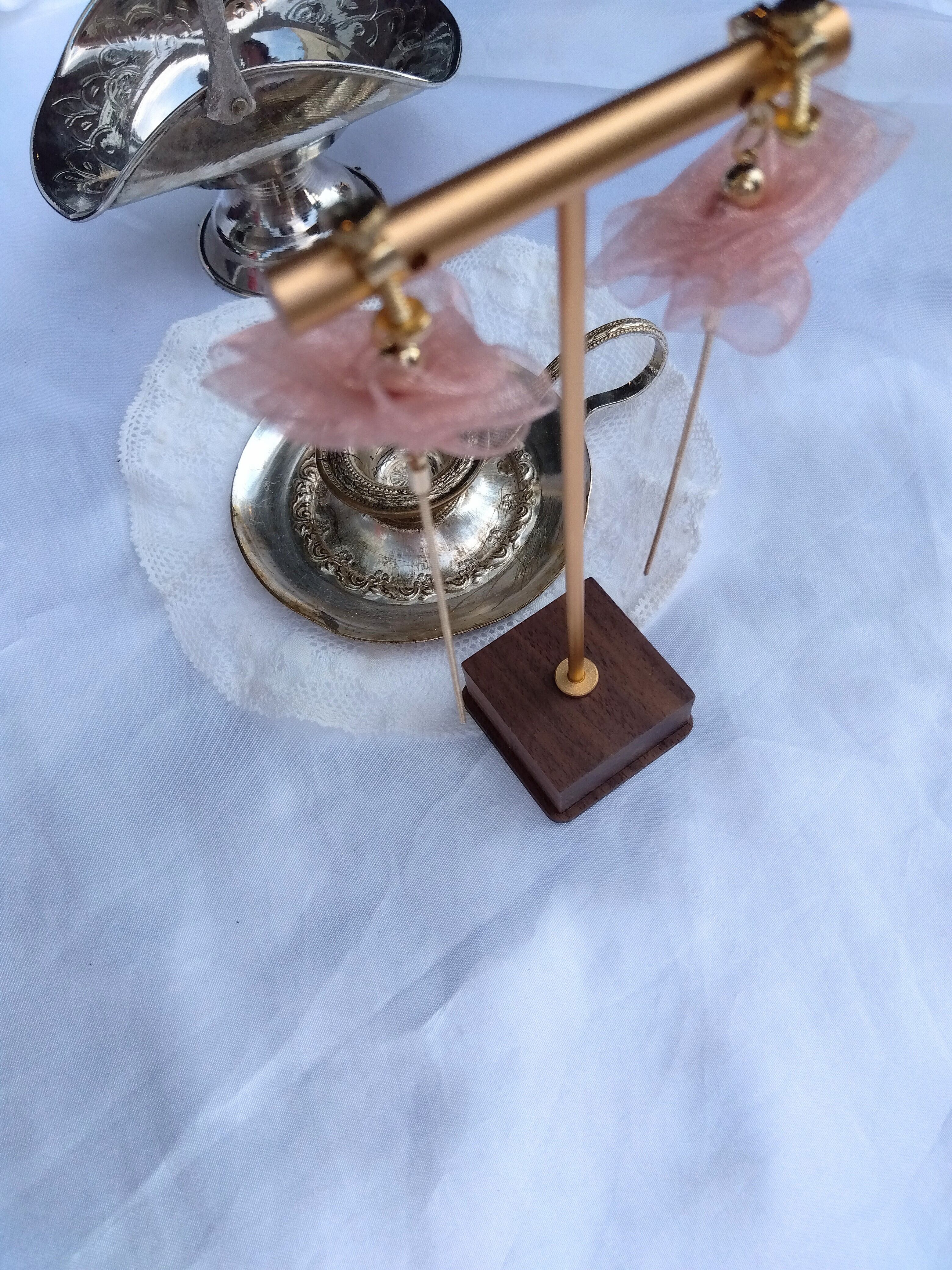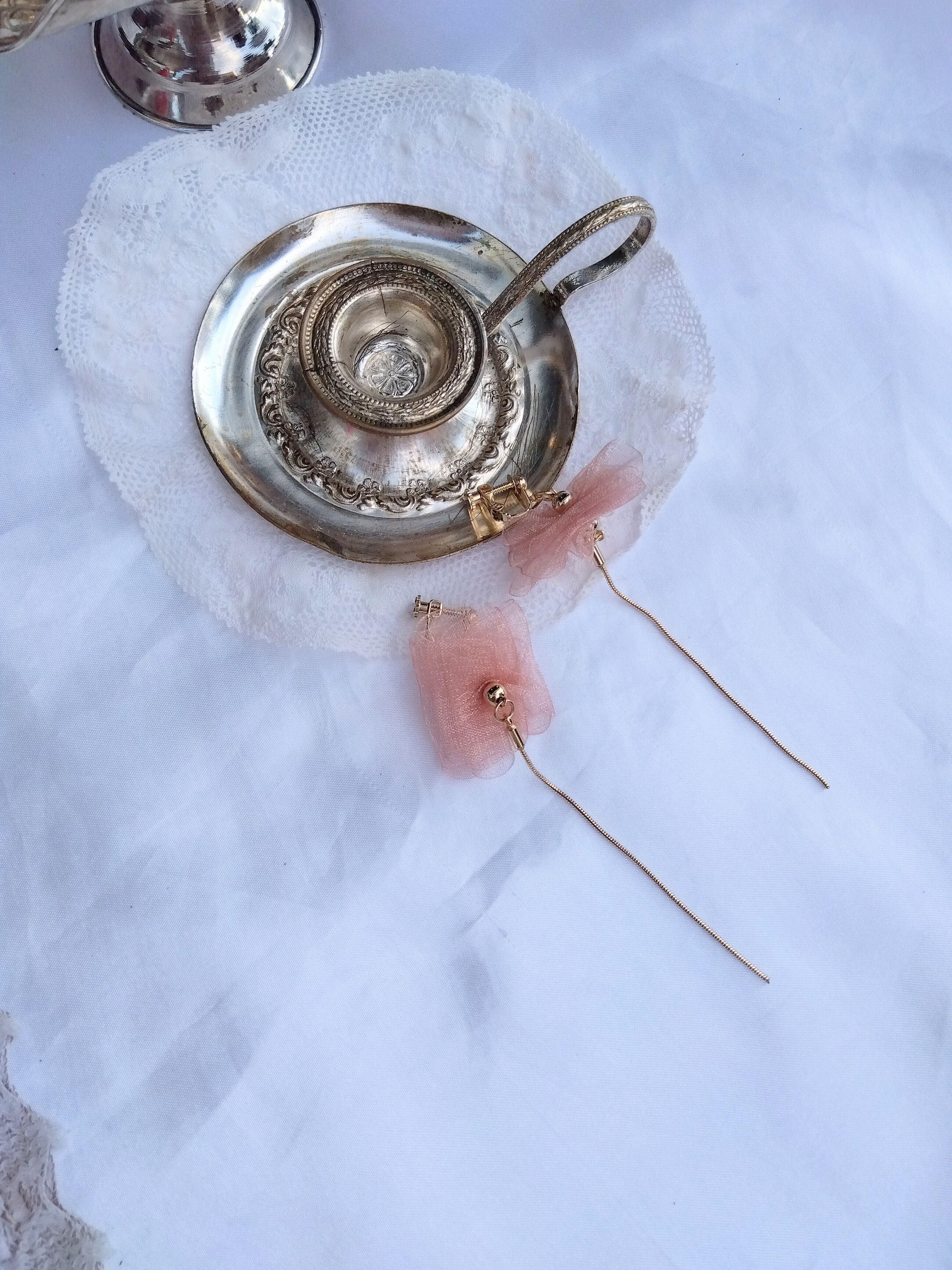 淡いピンクの小さなお花をイメージし、ふんわりとしたオーガンジーリボンでひとつひとつ丁寧に縫い合わせて作ったイヤリングです。